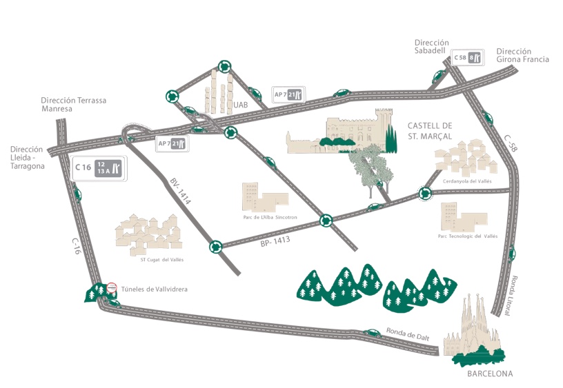 The castle is located 15 km away from Barcelona city center, about 20 minutes away by car, halfway between the towns Sant Cugat del Vallès and Cerdanyola del Vallès.